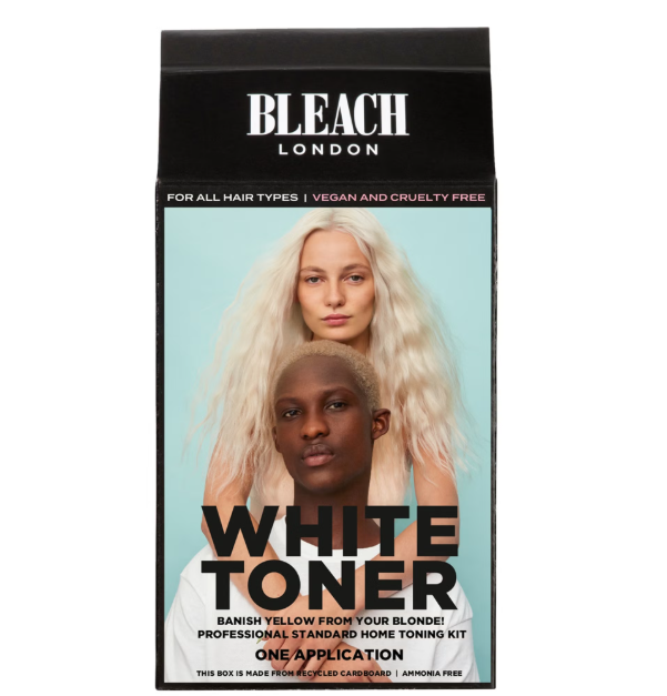 A semi-permanent toner kit that neutralizes yellow or brassy tones in pre-lightened hair, leaving a cooler, icy-white finish.