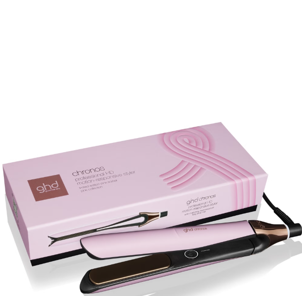 A limited-edition high-performance hair straightener in a pink sorbet finish, designed to support breast cancer charities. The ghd Chronos delivers fast, salon-quality styling with advanced heat technology for smoother, shinier hair in one pass.